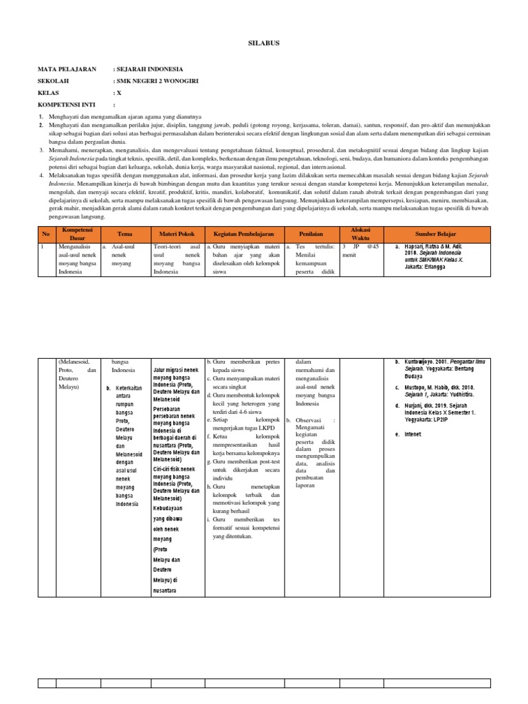 Silabus Mata Pelajaran Sejarah Indonesia Sekolah Smk Negeri 2 Wonogiri Kelas X Kompetensi Inti