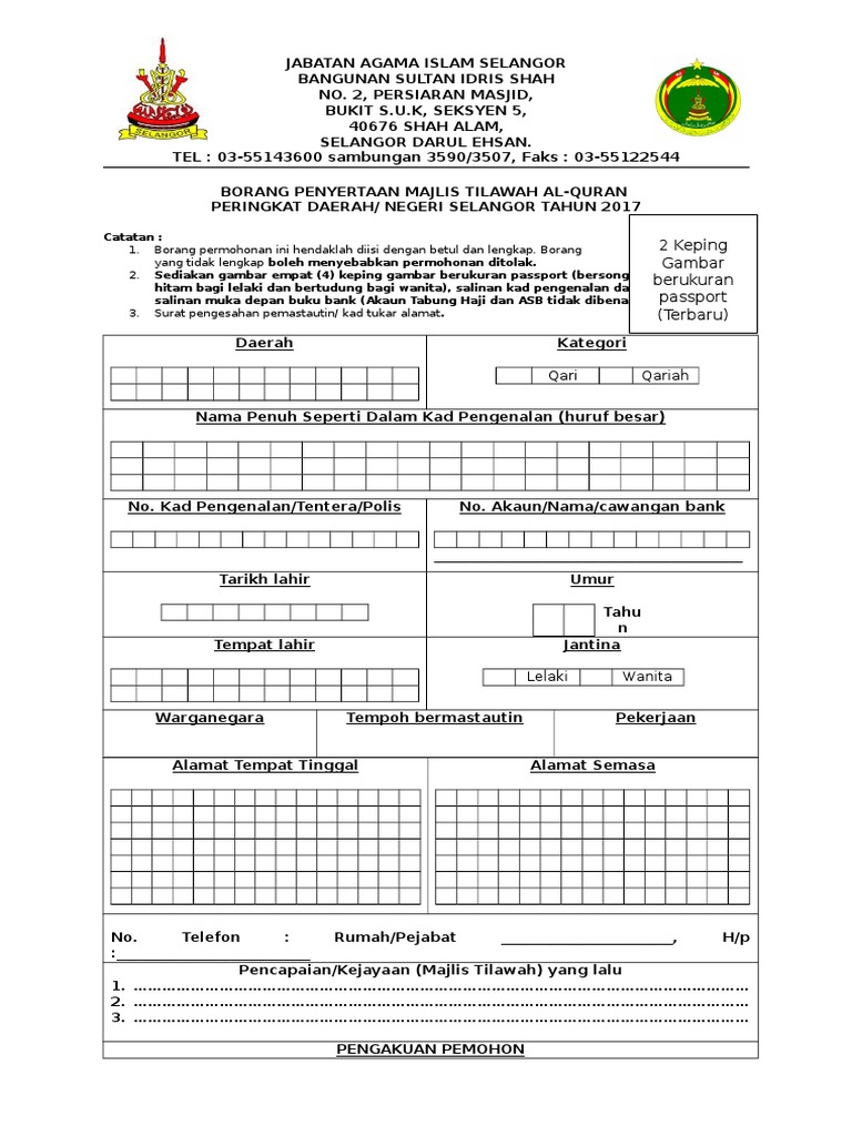 Borang Penyertaan Tilawah Daerah 2017 K Selangor